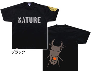 そして背中の大きなクワガタ……これがただのクワガタではない!イラストレーターではなく、命を吹き込むとも言われている京都の絵師の方に描いてもらったんだ。じっと見ていると、今にも動き出しそうな雰囲気を感じる!そのクワガタには蛍光インクを施しているので、暗いところで光を当てるとぼんやりと浮かび上がるようになっているよ。仕上げにI Love NYのパロディでI Love NT(ネイチャー)の4文字をプリントして、こだわりにこだわり抜いたグッドネイチャーなオリジナルTシャツの完成だ!